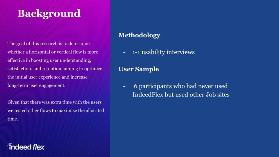 When I joined Indeed Flex, the onboarding process for new users was long, inconsistent, and prone to drop-offs. This created friction for job seekers eager to start booking shifts quickly. My role was to identify pain points, streamline the process, and create a more cohesive, intuitive flow that balanced compliance requirements with speed and clarity.