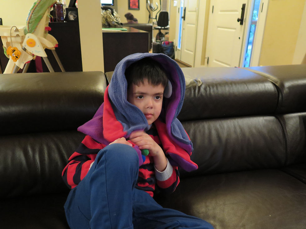 An adjustable weighted scarf, is attached to the hood, enwraps the child to give them a sense of comfort and balance while keeping them calm and preventing repetitive behavior.