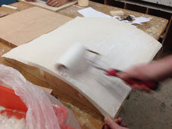 ![]() Applying glue on fabric | ![]() put it in vacuum bag press | ![]() Cutting the expand shape with jigs help |