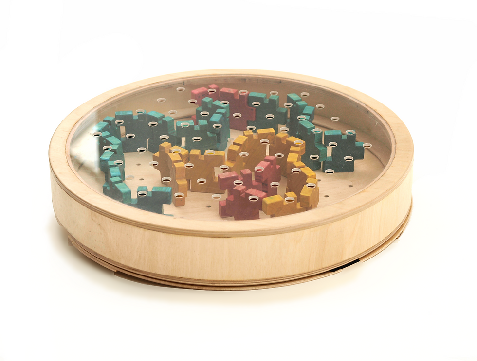 Wheel Puzzle contains 50 wood pieces with which kids can make their own path, drop the marble in and then they can put the lid on and start playing with it by changing the path with a key.